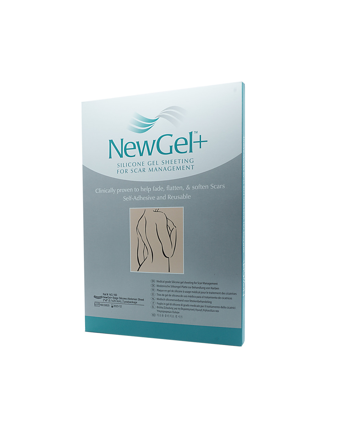 Die NewGel+ Silikongel-Folie ist je nach Bedarf und Form der Narbe in Streifen, Folien und Punkten erhältlich. Ebenso gibt es Folien für extra zugeschnittene Körperpartien wie Brust, Bauch, Ohr, Nase oder Kinn.