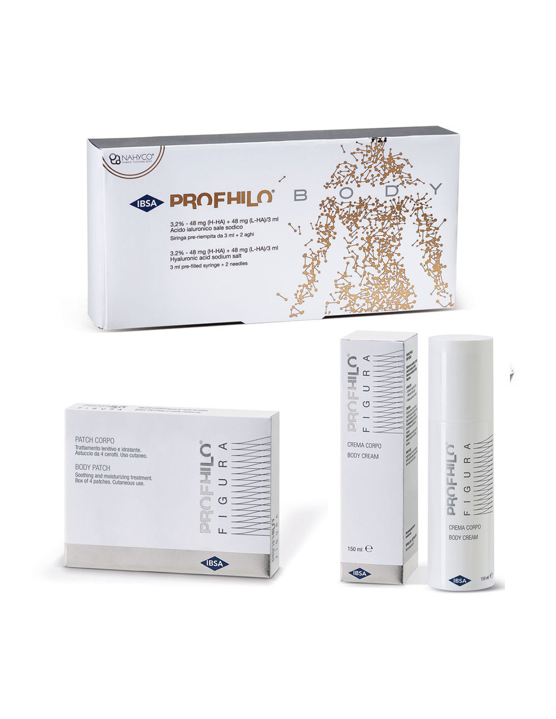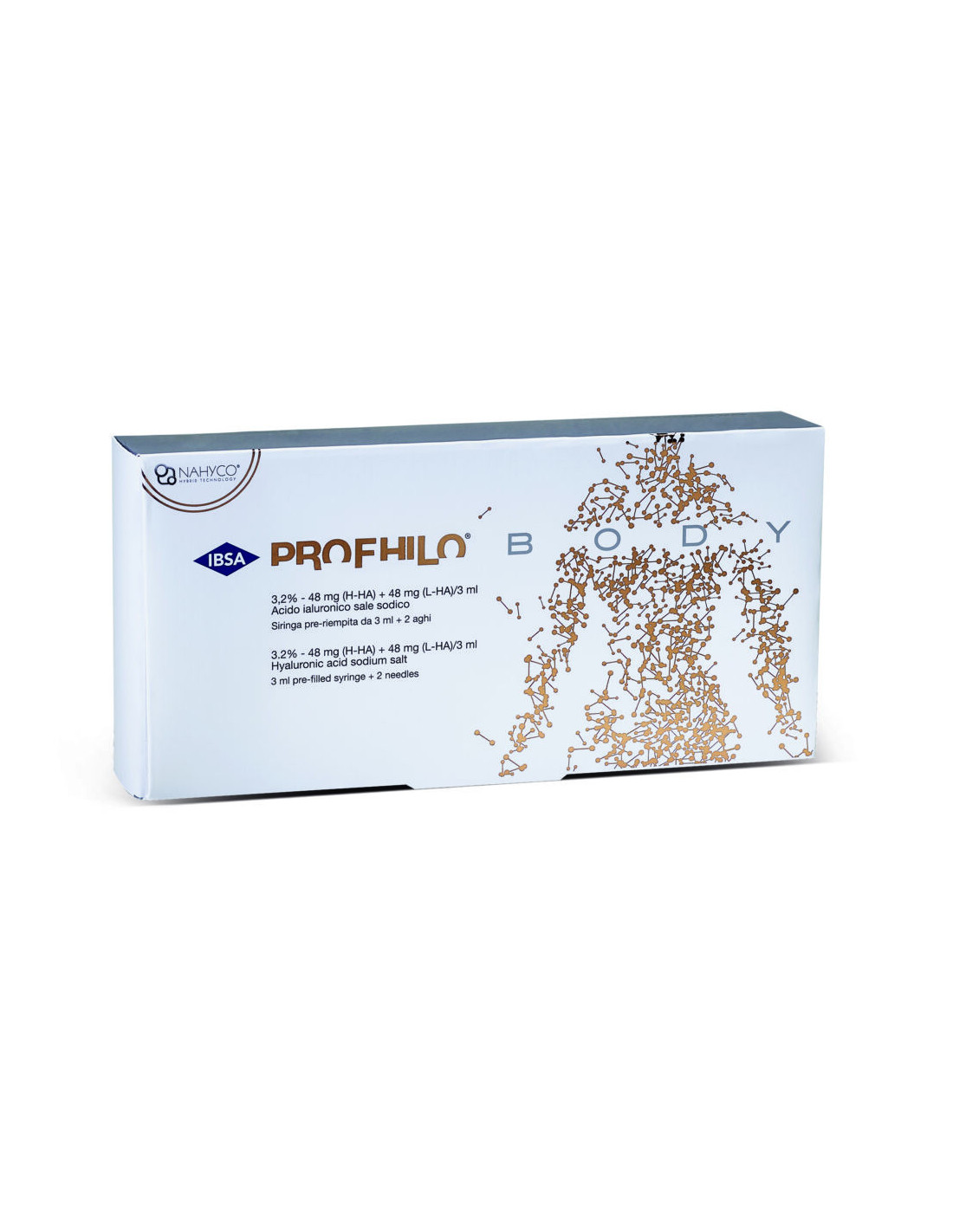 PROFHILO® BODY is characterised by high and low molecular weight Stable Cooperative Hybrid Complexes (HCC) of high concentration Ultrapure Hyaluronic Acid, produced using a unique and innovative thermal production process patented by IBSA, the NAHYCO® Technology.
